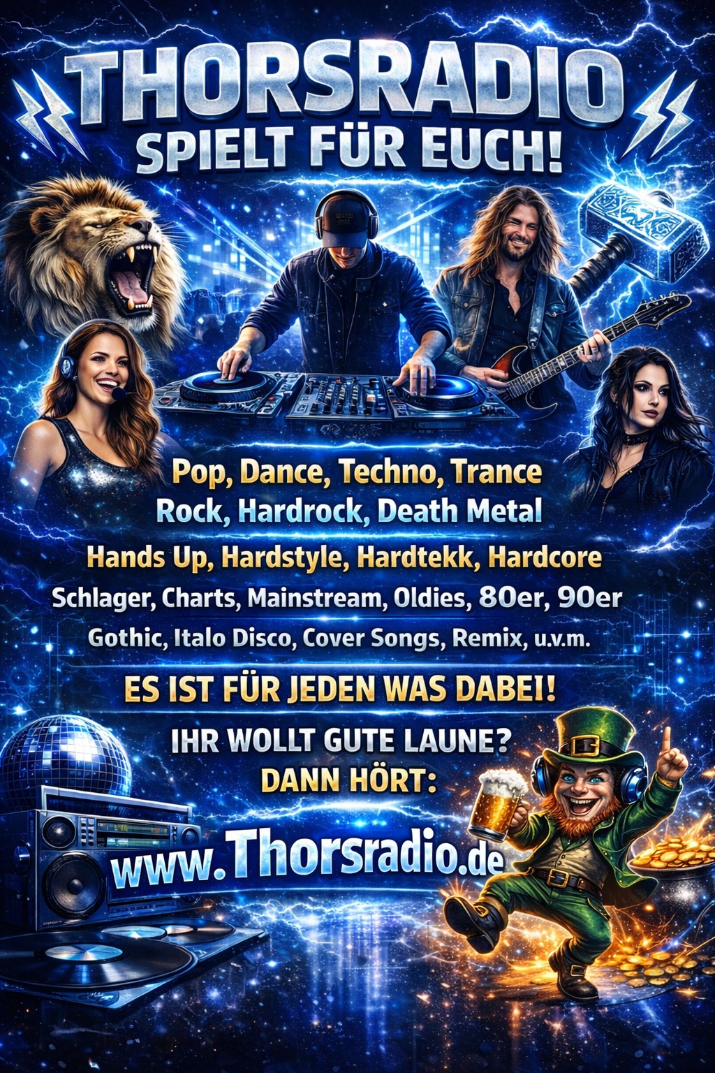 +++ Herzlich Willkommen bei Thorsradio +++ Wir spielen für euch die Musik für Körper und Geist - Bei uns fühlt man den Beat und spürt das Donnern der Boxen +++ Hast Du Lust bei uns mitzumachen? Dann fülle unser Bewerbungsformular aus und vielleicht bist Du schon bald bei uns "Live on Air" +++